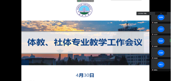 为破解体育专业课程线上教学难题,体育教育和社会体育指导与管理两系于4月30日16:00时通过“腾讯会议”召开了体育专业线上教学专题研讨会。会议由社会体育指导与管理系主任孔祥魁老师主持,张艳红副院长、体育教育系主任杨青宝老师等40名专业教师参加了本次会议。