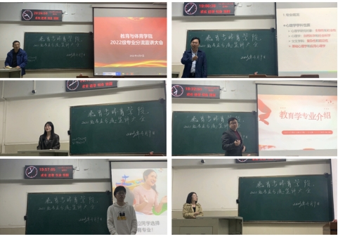 会议伊始,朱老师从专业概况、师资队伍、学科方向,优势与特色方面为大家详细介绍了应用心理学专业。王老师从专业定位、优势特色、师资力量,核心课程以及毕业要求等方面介绍了教育学专业。紧接着,杨老师从基本状况、培养目标、课程设置,发展前景几个方面介绍了学前教育学专业。陈博文和张可欣根据自身的学习成长经历分享了学前教育学的专业特色和体会感悟。最后,杜院长进行了总结。杜院长提出要结合个人兴趣,明晰分流选择,并祝福同学们都能择其所爱,得其所愿,在人生的道路上砥砺前行,早日成为那举大旗、担大任的新时代青年。