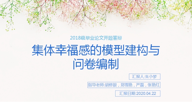 本次例会是第二场研二同学的开题预答辩,由朱小梦同学介绍自己的研究设计。为了使集体幸福感的概念更为直观、系统且具备可操作性,研究试图定义集体幸福感并建构社区层面的集体幸福感模型,在此基础上编制集体幸福感问卷,以此来了解当前社区居民的集体幸福感现状。首先是介绍了幸福观、主观幸福感、心理幸福感、社会幸福感和集体幸福感的定义,及其相关研究。综述部分还指出集体幸福感的影响因素有文化因素、个人因素、家庭和社区动态、社区特征、社会资本和人口学因素。然后朱小梦同学提出了初始问卷编制的步骤有问卷维度建构、拟定问卷的条目、预测问卷的形成、预测问卷的发放、预测问卷的数据处理、正式问卷的形成这六个步骤。该研究的特色是对集体幸福感的概念、结构和影响机制等进行分析构建集体幸福感模型,并编制国内首个以社区居民为研究对象的集体幸福感问卷。而研究难点在于:一方面,国内集体幸福感相关研究较少,收集资料以及在构建集体幸福感模型方面存在困难。另一方面,以社区居民为研究对象,在被试的选择以及施测的过程中均存在困难。