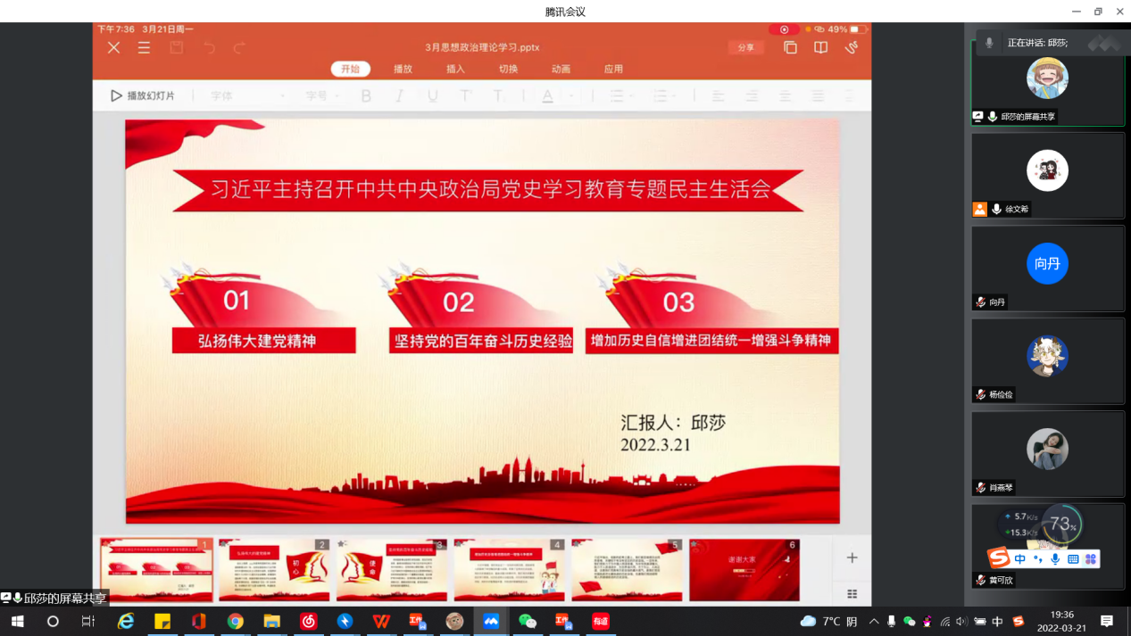 (通讯员 杜馨)为了进一步加强对党的思想与精神的学习和领悟,不断保持和增强政治性、先进性、群众性, 团结引领广大新时代新青年永远跟党走、奋进新征程,球王会体育平台网页2020及2021级研究生于3月15日至3月31日,以班为单位,开展了线上、线下相结合的政治理论学习活动。
