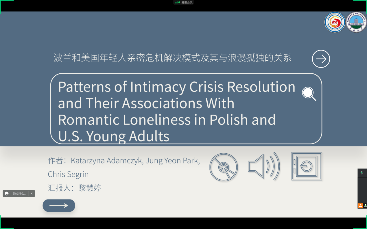 接着,黎慧婷同学进行了文献汇报。题目为《波兰和美国年轻人亲密危机解决模式及其与浪漫孤独的关系》。这是一篇跨文化的研究设计。黎慧婷同学为我们详细讲解了这篇文章的详细结构,使我们了解到了不同文化下的年轻人大的亲密危机和浪漫孤独的关系。她也向大家分享了自己读完后的个人感悟,提出了数据处理的重要性。
