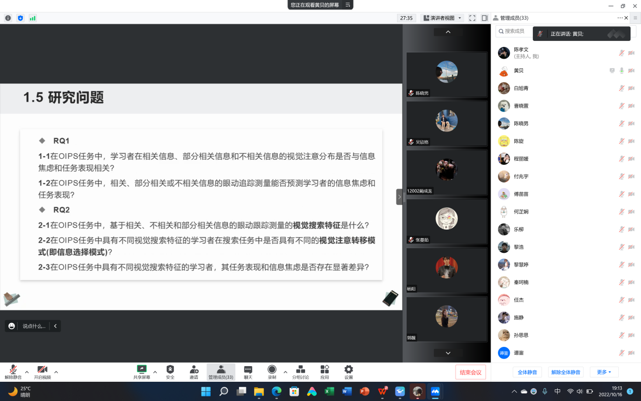 2022年10月16日晚7点,第54期青少年网络心理与行为专题例会在线上召开。此次例会共30余人,包括硕士生导师朱晓伟老师,连帅雷老师和课题组的研究生,以及部分本科生。本次会议由黄贝和黎慧婷同学汇报文献,由陈孝文同学负责本次的会议记录。