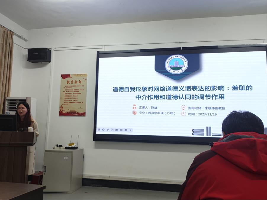 通讯员 陶燕林)2023年11月19日晚7点整,本学期青少年网络心理与行为第九期例会在5教203 正式开始,朱晓伟老师、连帅磊老师、甘雄老师、周婷老师参加了本次例会,还有部分研究生和部分本科生也参与了本次例会中,会议过程十分热烈。本次会议由两位研三同学带来毕业论文进展汇报。