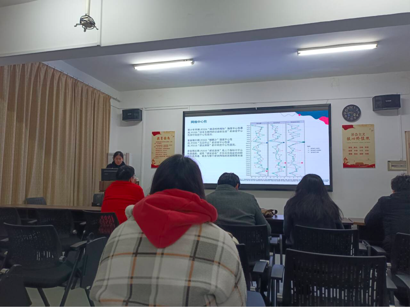 紧接着,张泽同学汇报了于2022年发表在《Computer in Human Behavior》上的文章《Core symptoms and symptom relationships of problematic internet use across early,middle,and late adolescence:A network analysis 》。该文章内容简洁明了,逻辑思路清晰,探究问题性网络使用在青春期三个阶段的核心症状及症状联系,并且介绍了网络分析这一研究方法,结果表明,青春期早期、中期、晚期三个时期的问题性网络行为的核心症状有所区别,但核心症状不会随年级的增加而增加,为有针对性的进行干预研究提供了良好的思路。汇报结束后,连老师指出这篇文章关于青春期阶段的划分值得我们学习,并且可以将今天汇报的两篇文章应用于研究生毕业论文设计当中去。