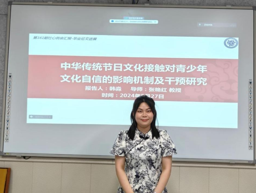 中华传统节日作为我国悠久历史和灿烂文化的重要组成部分,不仅承载着丰富的文化内涵,也是增强民族文化自信心的关键因素。韩淼同学的汇报基于社会文化理论和社会认同理论,旨在探讨青少年个体的中华传统节日文化接触对文化自信的影响,以及共享意图与身份认同的并列中介作用。研究一采用问卷法探究中华传统节日文化接触对青少年文化自信的影响机制;研究二采用团辅干预探究共享意图和身份认同对青少年文化自信的影响,并基于此提出培养青少年文化自信的教育对策。