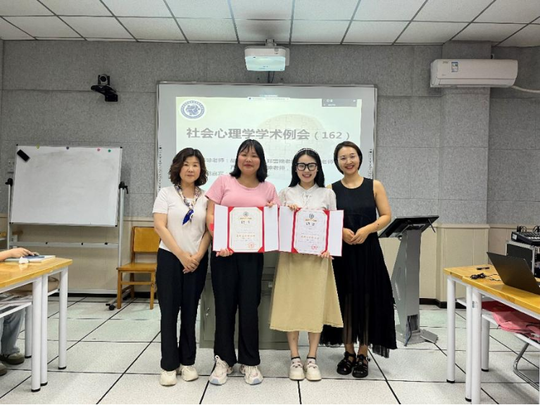 在正式汇报前,由郑老师和甘老师为大四毕业生颁发本科生科研助理证书并合影留念。在此过程中,中心导师不仅对两位本科生科研助理在中心的学习态度给予了充分的肯定,而且对其工作中的责任心表示赞扬。同时两位同学分别讲述了自己一年以来在社心成长经历,并向中心各位导师表示由衷地感谢,最后祝愿长大社心越办越好。