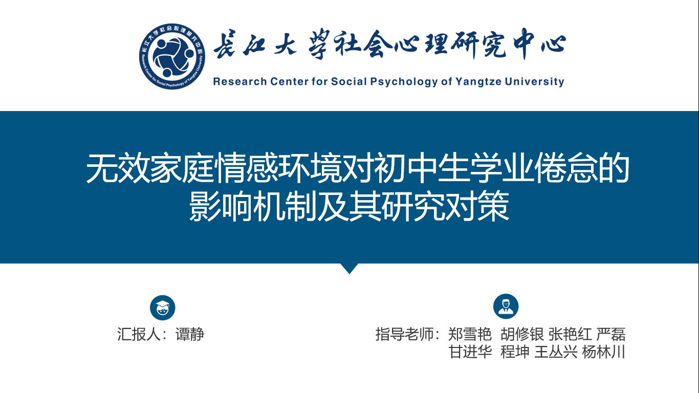 例会的第一个环节是:由谭静、韩淼、朱成程三名同学进行毕业论文进展汇报。首先是谭静同学,汇报内容为《无效家庭情感环境对初中生学业倦怠的影响机制及其研究对策》。其研究从社会学习理论出发,探讨无效家庭情感环境对初中生学业倦怠的影响机制及其研究对策。研究一采用问卷法,探讨了无效家庭情感环境与初中生学业倦怠的关系,并考察同伴关系与逆反心理在其中的作用机制;研究二采用干预法,通过对无效家庭情感环境进行干预辅导以期降低初中生的学业倦怠水平。