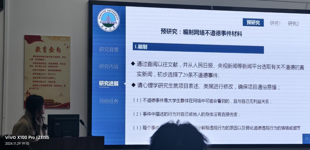 本次例会我们有幸听取了两位同学的精彩汇报。首先,程丽媛同学进行了毕业论文进展汇报主要探讨了网络不道德行为的影响机制及其干预模式。