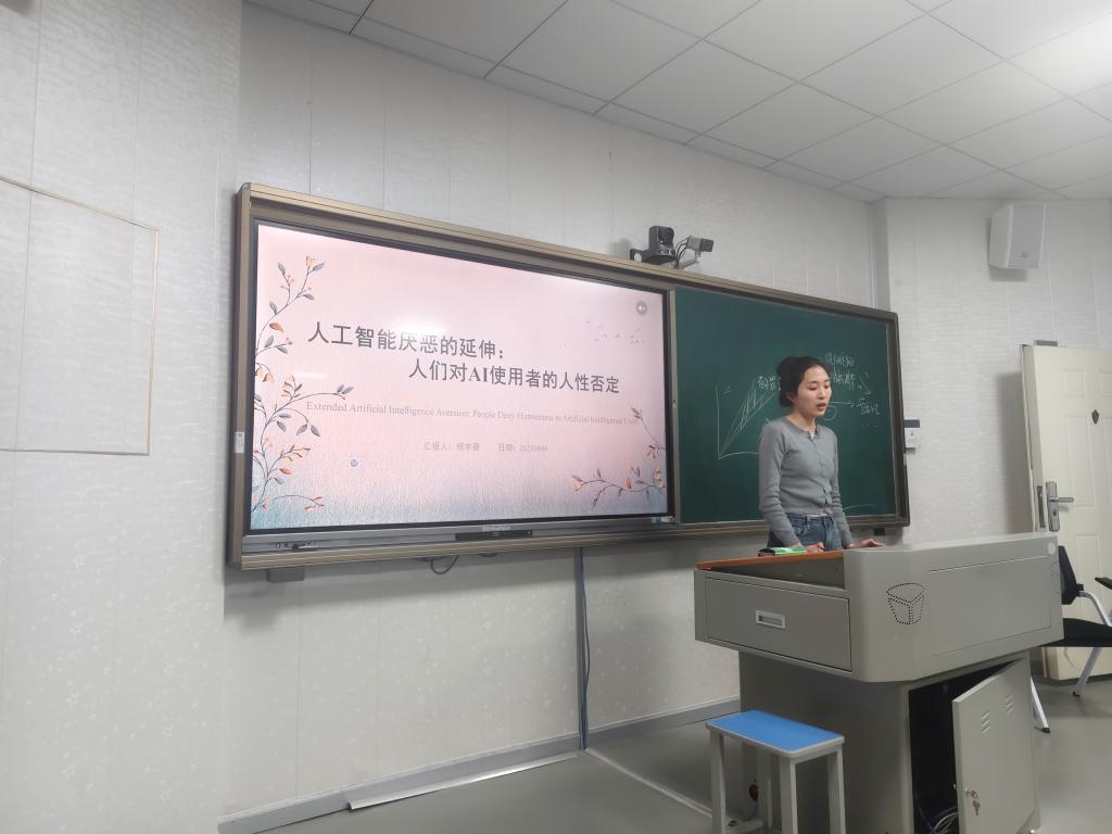 最后,杨宇蓉学姐带来的是发表在《Journal of Personality and Social Psychology》上的一篇文章题为《Extended Artificial Intelligence Aversion: People Deny Humanness to Artificial Intelligence Users》。该研究探讨了相较于非AI使用者(人类建议寻求者),人们是否更倾向于否认AI使用者(AI建议寻求者)的人性特质?如何预测并干预这种针对AI使用者的去人性化现象?8项研究表明,个体对AI建议寻求者(相比于人类建议寻求者)赋予更少人性特质。去人性化在基本人性纬度(情感性)比独特人性纬度(理性)更显著。汇报结束后,朱老师对其各部分实验研究进行了阐述,并引导同学对其研究结果进行讨论和解答。