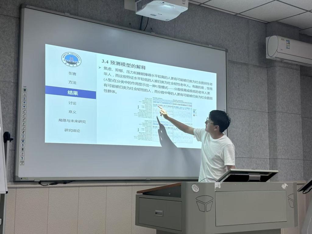 最后,张绍杰分享的文章—《Deciphering key features of social resilience versus social vulnerability in later life: A biopsychosocial model of social asymmetry》,通过分析中国和美国老年人数据集,利用多种算法探究老年社会不对称现象。研究发现,社会弹性老人更普遍,抑郁、焦虑、压力、睡眠障碍和人格是关键特征,据此可构建预测模型,为提升老人社会适应性提供理论依据。
