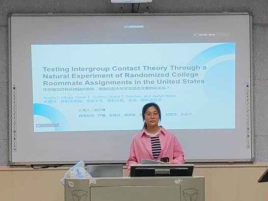 最后是夏文婕同学对《按照增加跨种族接触的原则,强制分配大学室友能否改善群际关系》进行汇报。本研究利用随机分配室友的自然实验,测试了基于室友种族的室友关系、态度和行为变化。研究发现表明,在大学校园的背景下,随机分配室友政策是促进跨种族接触的有效途径,且对关系质量的负面影响有限。
