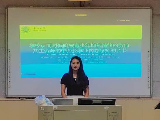 首先,李璐瑜同学对《学校认同对低阶层青少年抑郁情绪的影响:共生资源的中介及学业内卷感知的调节》进行汇报。李璐瑜同学立足于社会认同理论、社会认同影响抑郁的能动-共生模型、规范焦点理论,采用问卷法与课程干预,深入探讨了学校认同对低阶层青少年抑郁情绪的影响,以及共生的中介作用、学业内卷感知度对于抑郁情绪的调节作用。