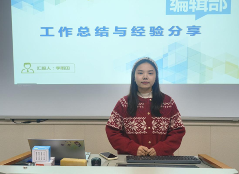 前任副团长郎浩原围绕工作情况、经验总结以及工作反思三部分进行线上分享。在海报与稿件的审核方面,她分享了自己“从上至下”审核海报的方法,还包括稿件审核的四大方面:内容、格式、字数、语言;在工作反思上,她提出加强考勤记录整合与例会拍照提醒,提升工作效率。