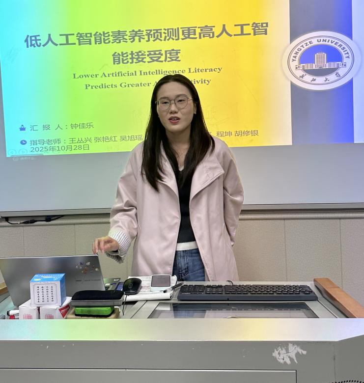 其次,钟佳乐同学从问题提出、研究方法与结果、研究讨论方面进行了文献汇报,其题目为《低人工智能素养预测更高的人工智能接受度》。