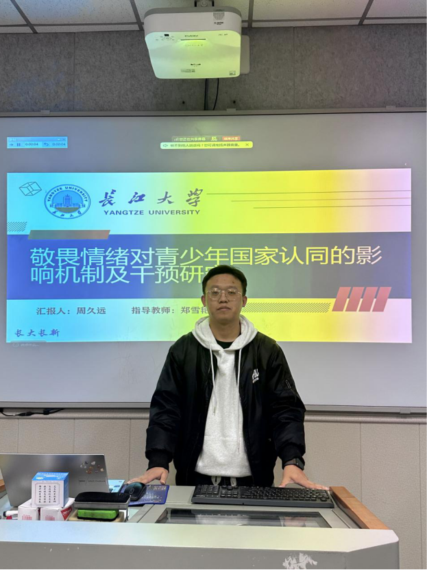 首先,周久远同学从选题背景、问题提出与假设、研究内容与方法上进行了毕业论文预答辩,其论文题目为《敬畏对青少年国家认同的影响机制及干预研究》。