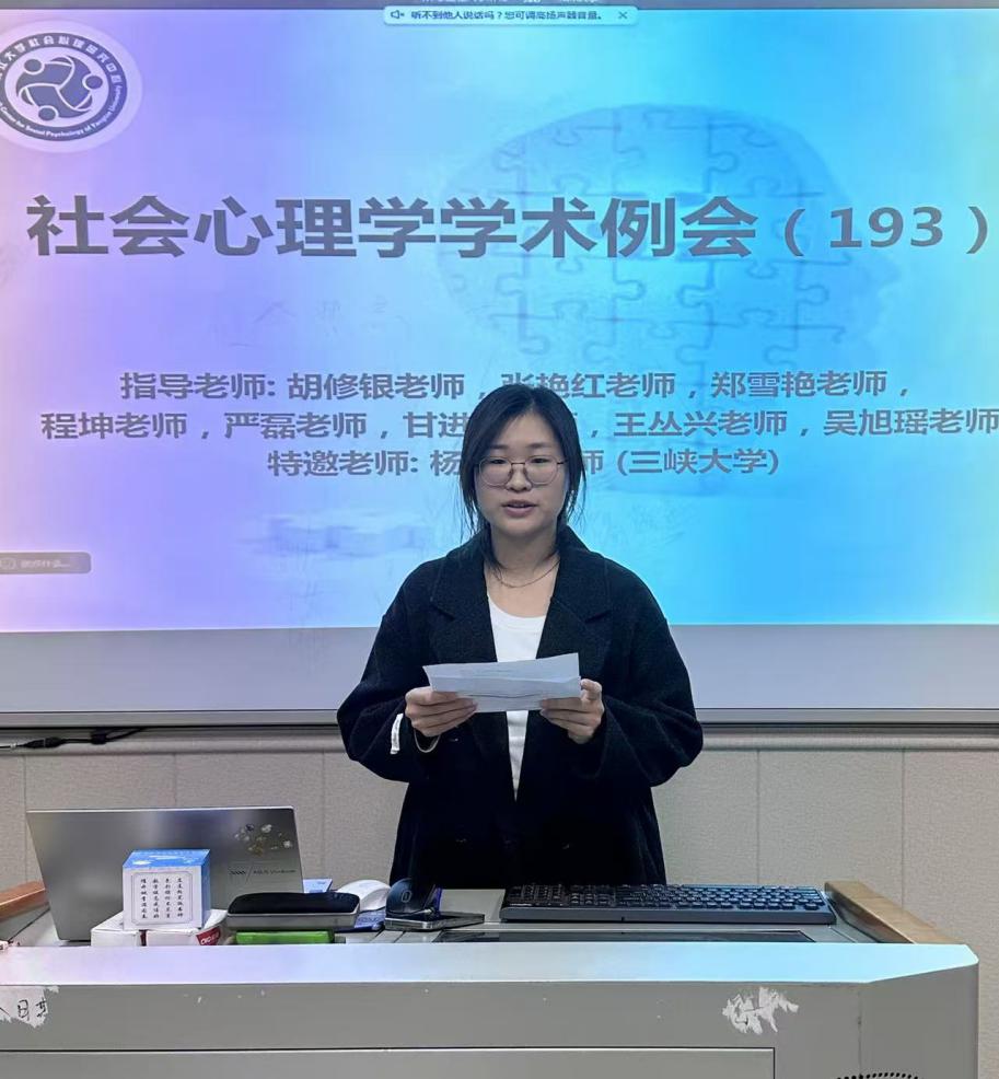 (通讯员:杨梦云)2025年10月28日19时至22时,第193期社会心理学学术例会在球王会体育平台网页东校区11教201室线上线下同步举行。本次例会由周瑶同学主持,主题为“毕业论文预答辩”与“文献汇报”。参加本次例会的老师有郑雪艳老师、严磊老师、甘进华老师、王丛兴老师、吴旭瑶老师和杨林川老师(三峡大学),学生有14名心理学研究生,15名本科生科研助理。