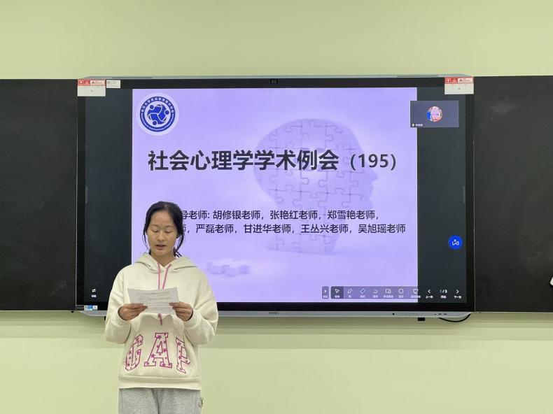 (通讯员:张立华)2025年11月11日19时00分至21时00分,第195期社会心理学学术例会在球王会体育平台网页东校区16教A102室如期举行。本次例会采取线上线下相结合的形式,由本科生科研助理陈傲霜同学主持,主题为“毕业论文预答辩”。参加本次例会的老师有王丛兴老师、吴旭瑶老师和杨林川老师(三峡大学),学生有14位心理学研究生,20位本科生科研助理。 首先,刘嘉玲同学进行了毕业论文预答辩,其论文题目为《经济不平等影响群际妒忌的心理机制研究》。 刘嘉玲同学遵循“概念澄清﹣因果关系﹣机制探索”的思路,探究经济不平等影响群际妒忌的心理机制。她的研究包含三个部分:研究一采用访谈法、扎根质性研究和因素分析法,探明群际妒忌的概念内涵及测量工具;研究二采用实验室实验法,检验经济不平等影响群际妒忌的因果条件;研究三采用问卷调查和实验法,检验其中的心理机制。汇报的最后,刘嘉玲同学分享了其后续工作安排及待讨论的问题。 其次,李璐瑜同学进行了毕业论文预答辩,其论文题目为《学校认同对低阶层青少年抑郁情绪的影响:共生资源的中介及学业内卷感知的调节》。 李璐瑜同学立足于社会认同理论、社会认同影响抑郁的能动共生模型、规范焦点理论,采用问卷法与课程干预的研究手段,旨在深入探讨学校认同对低阶层青少年抑郁情绪的影响,以及共生的中介作用、学业内卷感知度对于抑郁情绪的调节作用。汇报的最后,李璐瑜同学分享了其后续工作安排。 教师点评环节,针对刘嘉玲同学的汇报,杨林川老师对其研究的理论创新价值进行了肯定,并提出几点疑问:(1)研究群际妒忌的原因以及群际妒忌的独特性;(2)群际接触在研究中的作用如何体现。王丛兴老师提出几点建议:(1)群际妒忌的概念界定需要进一步明确,以区分其与个体妒忌的界限;(2)研究方法与研究问题不匹配,建议采用实验法研究群际妒忌这种群体情绪。吴旭瑶老师提出了几点建议:(1)研究的实际范围是低阶层对高阶层的恶意妒忌,建议修改研究题目,明确研究范围;(2)研究模型中未充分考虑阶层流动、群体规模差异等因素。 针对李璐瑜同学的汇报,杨林川老师首先肯定了该同学的进步,并提出几点建议:(1)在做内卷干预时应有明确界限;(2)影响情绪的因素不止一个,在做干预时要考虑到一些变异情况。王丛兴老师提出几点建议:(1)要把社会阶层作为调节变量划分为低、高阶层进行对比,探究其显著性差异;(2)在后续干预过程中,要注意操作的规范性。 本次学术例会主要由研究生进行毕业论文预答辩。在此次例会中,老师们对同学们的汇报内容进行了相关指导,为她们后续研究的推进指明道路。至此,第195期社会心理学学术例会圆满结束,下周同一时间我们再会!