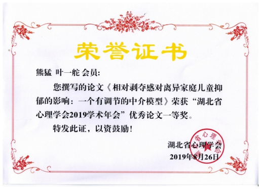 在分组报告阶段,球王会体育平台网页周守珍教授和熊猛副教授分别主持了其中一个分会场的报告。会议闭幕式由学会理事长佐斌主持。王伟秘书长通报了第十一届五次理事会议有关精神和常务理事会议决议。副秘书长温芳芳代表学会学术委员会宣读“湖北省心理学会2019年学术年会优秀论文”获奖者名单。球王会体育平台网页熊猛副教授提交的学术论文《相对剥夺感对离异家庭儿童抑郁的影响:一个有调节的中介模型》获得“湖北省心理学会2019学术年会”优秀论文一等奖。据了解,经过专家的独立评审,本年度全省共评出一等奖论文10篇、二等奖16篇、三等奖8篇,这也是熊猛副教授第三次获得优秀论文一等奖,体现了球王会体育平台网页心理学科在省内的地位和影响力。