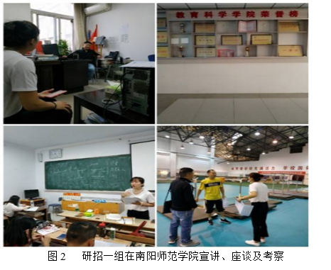 第一工作组由院长张相乐带队,研究生导师宋永晶副教授及研究生秘书代晋一行3人,于9月20日至22日前往北线的汉江师范学院、南阳师范学院、南阳理工学院3所高校开展研招宣传活动。20号下午4点,张院长一行与汉江师范学院教育学院领导进行座谈,介绍球王会体育平台网页研究生招生及培养的相关情况。晚上5点,宋永晶老师向有考研意向的同学们作招生政策宣讲,教室里座无虚席,效果较好。21号下午,张院长带领研招一组赶往南阳师范学院宣讲,张贴海报,发放宣传册,与相关院系领导座谈交流,就研究生招生工作交换意见,并考察了该校的体育场馆。22号上午,研招一组来到南阳理工学院进行第三场宣讲活动。