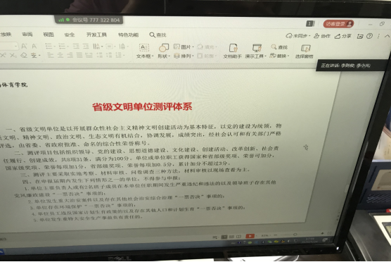 首先,张艳红副院长对近期教学工作情况进行通报,重点是在线教学开展情况与存在问题,并对后期教学工作进行了安排与提出要求。接着,李焕玉书记带领全体教职工学习了《深刻认识高校意识形态工作的重大意义》、《球王会体育平台网页校园意识形态阵地管理暂行办法》,并对教职工在教学、科研与网络安全等方面提出了具体要求。最后,按照学校5月份政治理论学习安排,学院党委副书记李则俊通过腾讯会议在线文档功能带领全体教职工学习了《习近平在陕西考察时强调 扎实做好“六稳”工作 落实“六保”任务奋力谱写陕西新时代追赶超越新篇章》、《习近平主持召开中央全面深化改革委员会第十三次会议:强调深化改革健全制度完善治理体系——善于运用制度优势应对风险挑战冲击》、《习近平主持中共中央政治局常务委员会会议:分析国内外新冠肺炎疫情防控形势——研究部署完善常态化疫情防控举措,研究确定支持湖北省经济社会发展一揽子政策》等一系列关于疫情防控和复工复产讲话精神,学习了冯征校长的署名文章《“凡事三有”推进大学治理现代化》、《高校师生新型冠状病毒肺炎个人防护指引》以及《省级文明单位测评体系》。