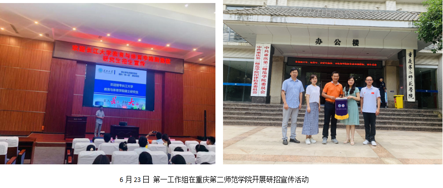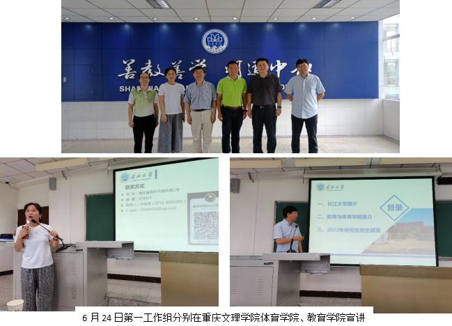 第一工作组由副院长杜光友带队,研究生导师宋永晶副教授及心理系主任朱晓伟博士一行3人,于6月22日至25日前往西南线的长江师范学院、重庆第二师范学院、重庆文理学院、内江师范学院4所高校开展研招宣传活动。第一工作组分别在长江师范学院体育与健康科学学院、重庆第二师范学院教育教师学院、重庆文理学院体育教育学院、内江师范学院的体育学院(教育学院学生亦一并参会)开展招生宣讲活动。招生宣传现场气氛热烈,学生们报考球王会体育平台网页意愿强烈。