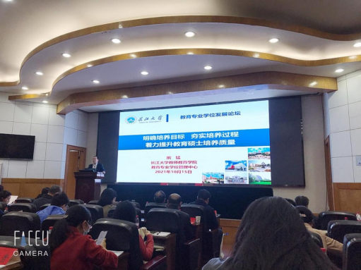 论坛由教师教育学院院长张相乐教授主持。论坛根据主题内容安排了七项议程。首先由研究生院副院长、研工部副部长(主持工作)赵辉教授宣读我校成立教育专业学位管理中心、成立教育专业学位研究生教育指导委员会的文件。随后,教师教育学院副院长熊猛博士作了题为《明确培养目标夯实培养过程 着力提升教育硕士培养质量》的主题报告,从我校教育专业学位发展简况、全国教育专业学位教指委工作要求、教育硕士培养导师及实践基地职责等方面,对全国教育专业学位研究生教育指导委员会有关要求做了详尽解读。
