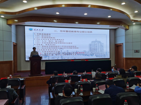 研究生院副院长余劲东博士围绕“完善过程监控、筑牢底线思维”对教育专业学位巡查与专项评估作了全面的布置和要求。他强调要注重专硕的差异性、指标的系统性,以提高教育专硕培养质量为目标,以维护学校学院切身利益为己任。