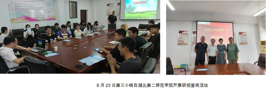 第三工作组由熊猛副院长带队,王卫宁教授、孔祥魁副教授一行三人于6月23日上午在湖北第二师范学院开展研招宣传活动,在湖北第二师范学院体育学院和教育学院联合宣讲,宣讲后现场登记了所有学生的信息和报考长大意愿。