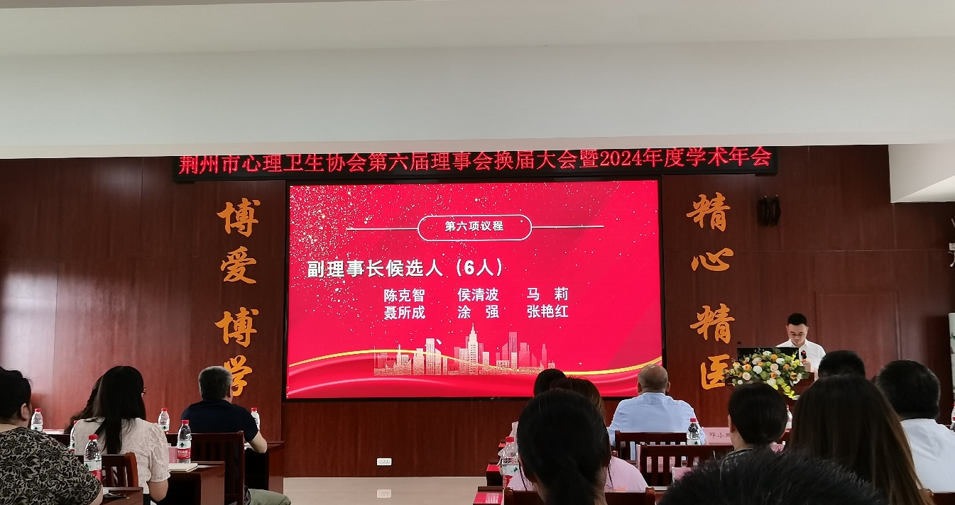 6月14日至15日,荆州市心理卫生协会第六届理事会换届大会暨2024年度学术年会在荆州市精神卫生中心召开。参会人员有新一届理事会、常务理事会推荐候选人,荆州市心理卫生协会会员,荆州市各医院、中小学、大专院校、社会机构等心理健康服务专业人员。学院院长张艳红教授应邀参会,换届会议各项议程依次进行,经投票选举,张院长全票当选为荆州市心理卫生协会第六届理事会副理事长。