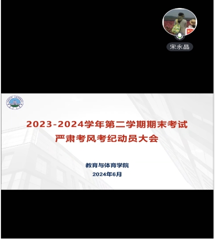 为端正考风,严肃考纪,确保球王会体育平台网页本学期期末考试的顺利进行和公平公正,球王会体育平台网页于6月21日上午10:30分线上召开严肃考风考纪动员大会,宋永晶副院长主持会议,全体监考教师参会。