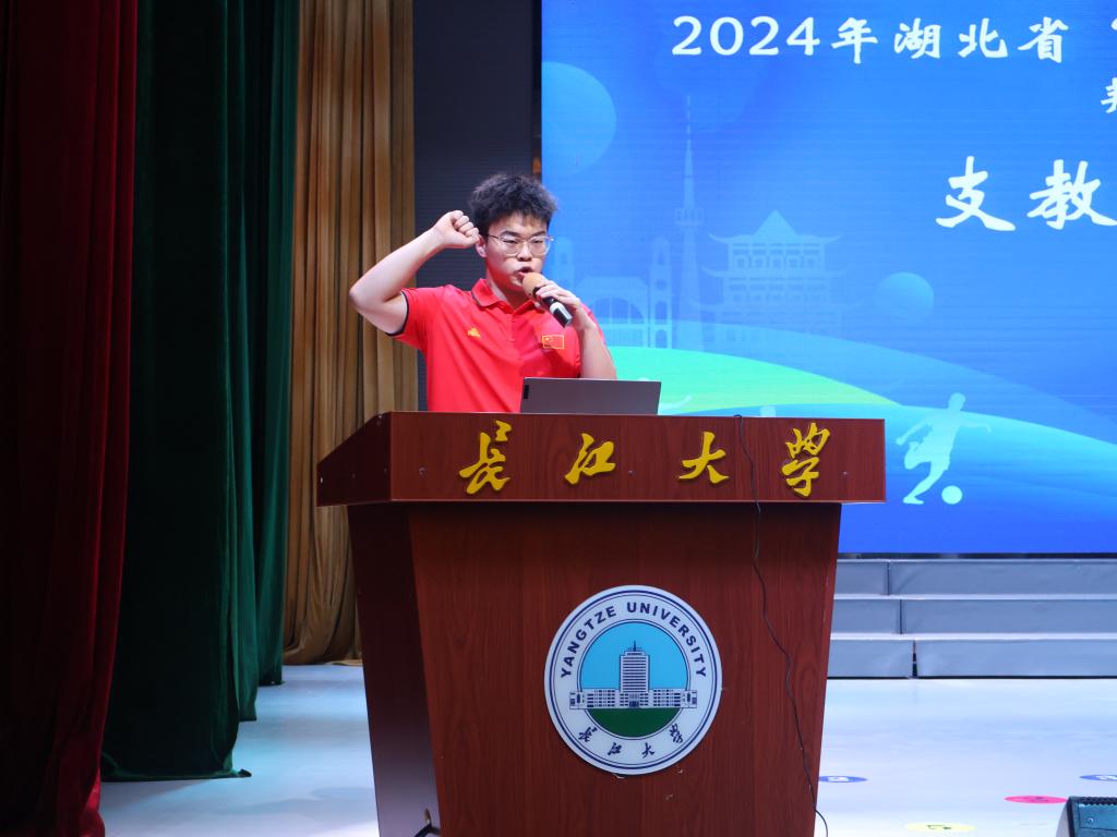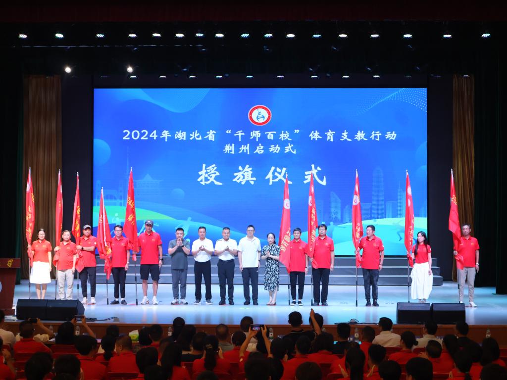 支教志愿者代表和领队代表分别郑重宣誓。全体志愿者和领队将严格按照省体育局体育支教相关要求,认真履职,扎实开展体育支教服务,助力荆州市青少年健康成长。李祥、陈庆华等分别为支教团授旗。