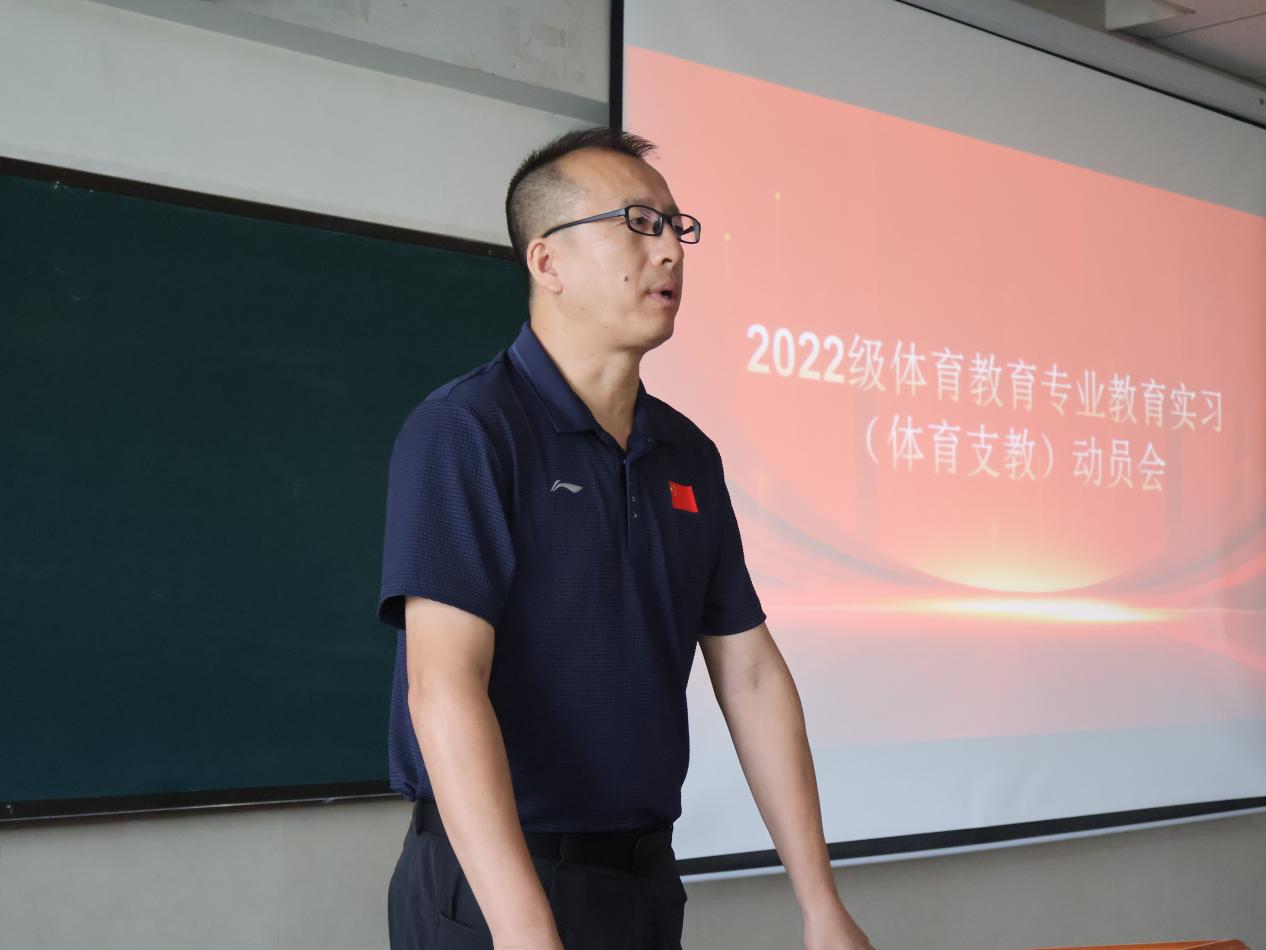 随后,杨青宝老师作实习动员讲话。他强调教育实习是人才培养关键课程,关乎学业与职业适配判断,学生需高度重视;要求学生严守纪律、树牢安全责任意识,将所学转化为教学实践以提升专业素养。同时,他提醒学生正视实习中可能遇到的挑战,既要团结协作,也要认清体育教师行业趋势、培养综合能力,严于律己并维护球王会体育平台网页教体学院形象,学院与指导老师将全力提供支持。