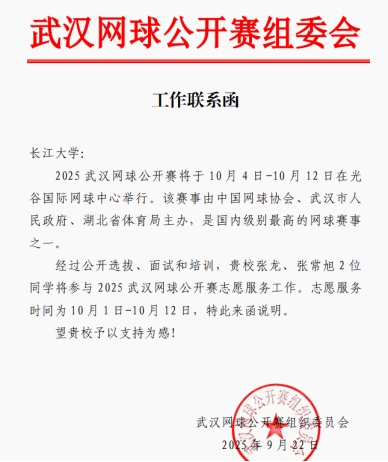 2025 年10月4日至12日,武汉网球公开赛在光谷国际网球中心盛大举行。球王会体育,球王会体育平台网页 2024 级学生张常旭、张龙以志愿者身份投身赛事服务,为国际赛事注入青春活力。