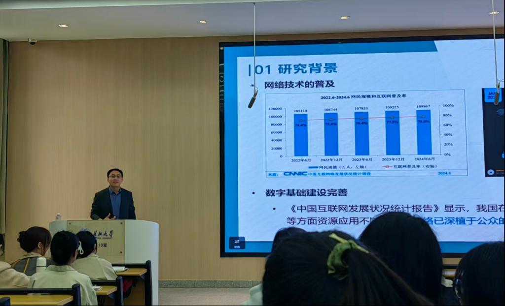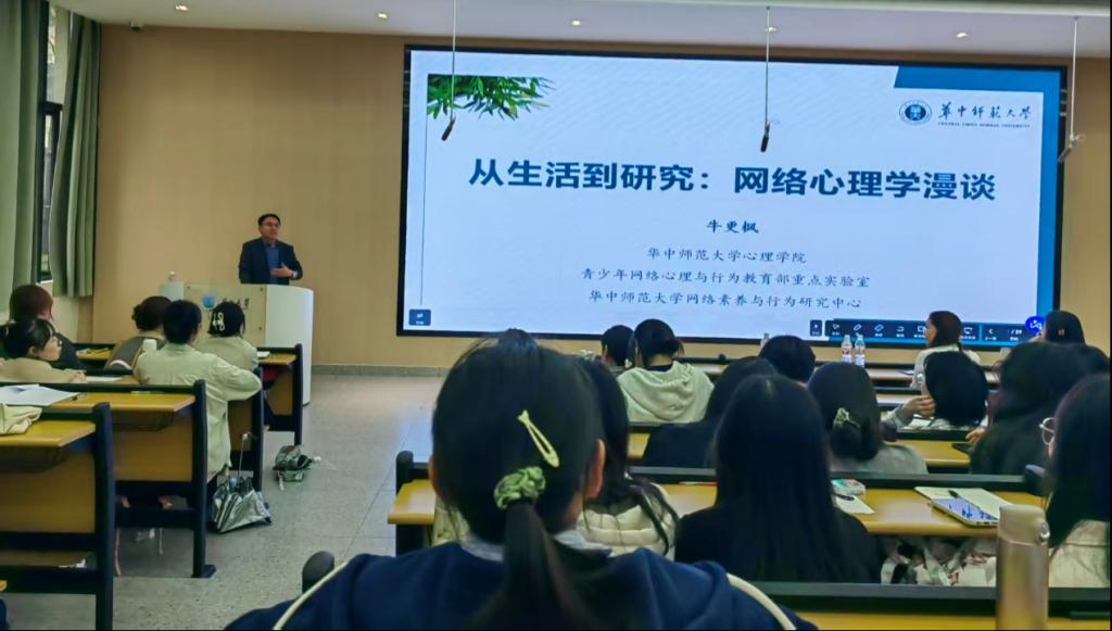 讲座伊始,朱晓伟老师对主讲人牛更枫教授进行了详细介绍。他重点提及牛教授在网络心理学领域的深厚学术积淀,包括主持中国博士后基金项目、担任多本SSCI与CSSCI期刊审稿人等经历,让在场师生对牛教授的研究方向与专业实力有了更清晰的认知,为讲座的顺利开展奠定良好基础。