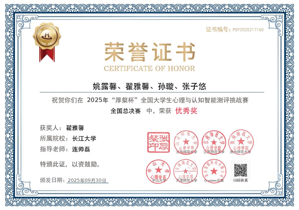 本次大赛以“心理学引领科学测评,智能化护航人才发展”为宗旨,旨在深化学生对心理与认知测评原理与方法的理解。作为首次参赛的团队,每一步都充满探索性,每位同学利用课余时间反复打磨细节,指导老师则在理论框架、研究方法等关键环节精准把关。这份成绩的取得,既源于团队成员的协作攻坚,更得益于学院长期践行的科创育人理念。未来,期待更多长大学子以这些同学为榜样,在心理学与智能科学的交叉领域大胆尝试、主动探索。随着学院“以赛促学”机制的不断深化,更多学子将在高水平赛事中崭露头角,学院也将在该领域持续突破,培养出更多兼具理论素养与实践能力的创新型人才,为心理测评行业发展与社会需求贡献“长大力量”。