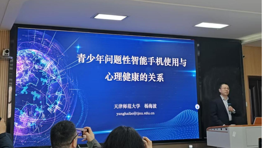下午的专题讲座于我校文科大楼910室召开,由我校严磊博士主持,参与人员包括:院长张艳红,心理学系主任朱晓伟,心理学系教师陈方、卢忠耀、连帅磊、王丛兴、甘进华等教师,及应用心理学专业大二全体学生。杨海波教授以一些生活化自测问题切入,快速引出“问题性智能手机使用”核心议题。他简要梳理背景:我国网民及未成年人网民规模、智能手机持有率均处于高位,城乡青少年互联网使用场景分化显著,智能设备普及已对儿童青少年认知发展、学习行为、亲子关系、社会化及心理健康形成五大维度挑战。