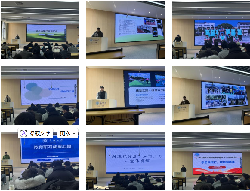 在主题分享环节,各组推选的代表依次登台,用6分钟PPT汇报展示了实习期间“最难忘的一堂课”“最敬佩的一位体育教师”以及“新课标背景下如何上好一堂体育课”等主题的思考与创想。鲜活的案例、真挚的情感、扎实的反思,赢得现场阵阵掌声。