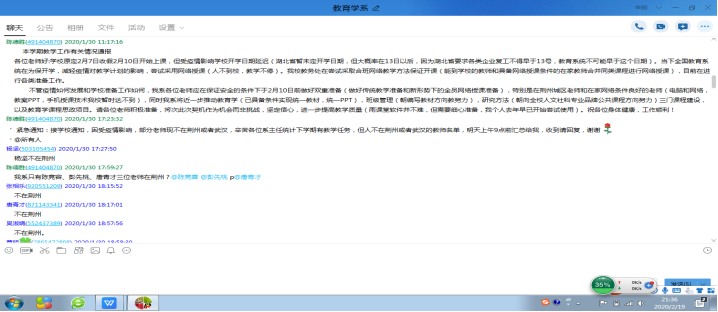 (4)把困难考虑得更多一些并提前准备好预案。基于对系情和在线教学的特点,我提前预估了各种可能的困境并要求老师们提前做好心理准备,比如网络问题、平台拥挤、学生不熟悉和抵制等问题,最终第一周出现各种问题的时候,我系老师们反映平淡,没有惊慌失措,而是顺利应对。
