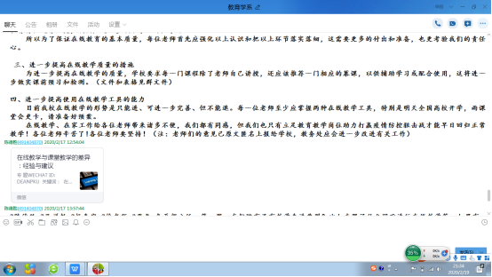 (2)提高教师们对在线教学意义的认识。我在教育学系内部对在线教学的定位是全国教育系统的共同努力方向,学校教务处的教学改革和我系教育学省一流本科专业建设的需要,是符合教育信息化的潮流,不是定位于我们学校自身的应对疫情的临时举措,要求老师们借此机会推进教学信息化而不是为完成任务。