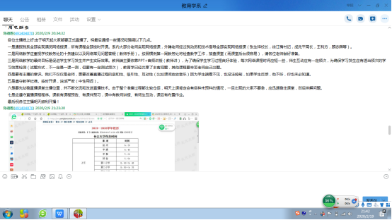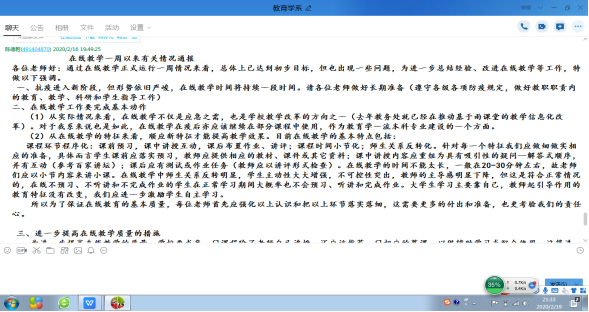 (5)交流总结经验并改进教学工作。我把我系在线教学工作分为开学前准备期、开学一周的试验期、开学第二周的改进期。在第一周结束的时候,针对老师们的交流和疑惑,我做了了在线教学工作的通报,对强化在线教学工作意义,分析了在线教学的新特征并要求老师落细落实各项备课、讲授和作业布置工作,宣布了学校的新举措,鼓励老师们坚持和改进工作。