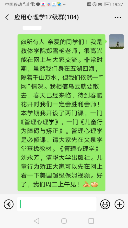 新冠肺炎疫情的出现让我们的工作和生活都发生了较大的变化,也受到了较大的影响,学生不能正常返校,老师不能和学生面对面授课,每个人的心理和行为都发生了诸多变化,遭遇了或多或少的冲击。郑雪艳老师也因年前前往深圳探亲被隔在了深圳,无法返回。在深圳的酒店,看到每天疫情的蔓延让她感到忧心,总想着该为抗击疫情而做些什么?作为一名高校教师,我们能做些什么呢?但因为湖北籍的原因,她几乎只能呆在宾馆房间里,在接到疫情防控期间的教学工作通知时,她知道会面临许多的困难,但有学校的统一指挥,有学院领导和同事的热心帮助和支持,有自己的努力,她相信这正是自己能为抗击这场疫情做些什么的时候了。