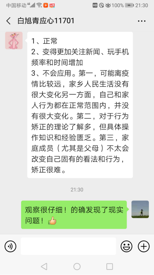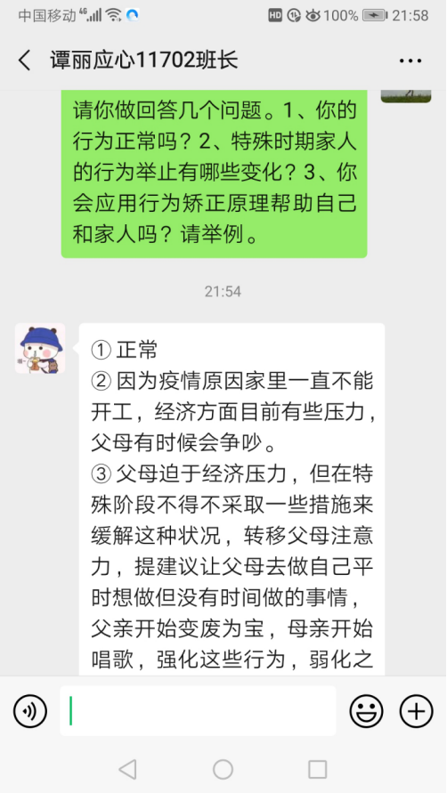 在教学过程中郑老师不仅注重学生对理论知识的掌握,更是充分发挥了课堂思政的作用,同时也对处于特殊时期的学生及时运用专业知识进行心理疏导。在网络教学过程中,郑老师要求同学们在听课前准备好笔和笔记本,坐在电脑前或者拿出手机放在桌上听课,这样便于集中注意力。促进同学们养成良好的学习习惯,在《儿童行为矫正》课中,鼓励同学们运用学到的知识点,对自己的良好行为进行强化,鼓励同学们运用专业知识帮助自己、家人和朋友。在授课过程中,有些同学有些焦虑、恐惧、悲伤等情绪,问到什么时候可以回学校,有些同学在家里呆久了烦躁无聊,有些同学每天过度关注疫情信息,甚至导致了替代性创伤,郑老师在课堂教学中结合案例,运用心理学知识安抚同学们情绪,帮助同学们客观分析各种信息,学会接纳,学会反思,学会沟通。让每个同学问问自己,“我在这场防疫战斗中,我的专业能为防控做点什么?”“我能做出什么贡献?”。