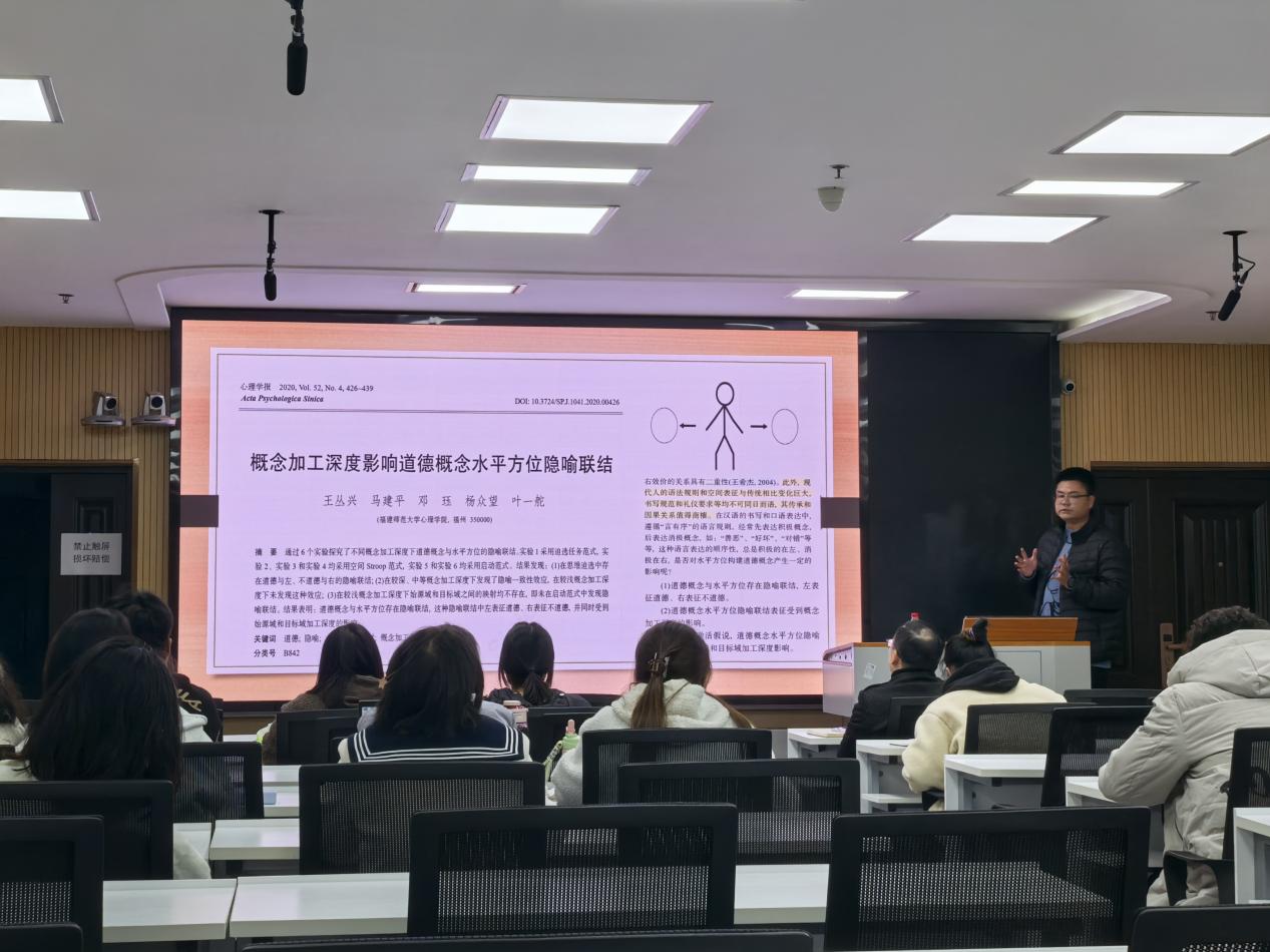 王丛兴博士讲座的主题是《具身认知的哲学原理及实证研究》,他从两个部分进行了论述,以哲学思想为基,引入理性主义和经验主义的内涵,并围绕身体现象学展开。他指出身体不仅是物理性的,也是现象性的,结合“蝴蝶效应”谈及钟表式科学与混沌系统,从系统水平理论视角对心智进行拓展性定义,向同学们介绍了延展认知、生成认知、概念隐喻和道德隐喻等含义。