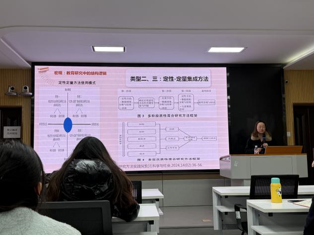 杨雪博士以《教育研究中的整体思维》为主题,从整体性思维的概述和整体性思维在教育研究中的应用两个方面分别展开论述。首先,她指出学术论文的两种基本逻辑结构是演绎的假设检验研究和归纳的理论建构研究,向同学们分别介绍了定量和定性方法的使用模式。其次,杨雪博士从论证的前提、结构、方法三个方面,从生活中和论文中的例子解释隐含假设的概念,以及告诉同学们要将论证的方法,包括演绎论证和归纳论证,与不同的纬度结合起来对论文进行分析。