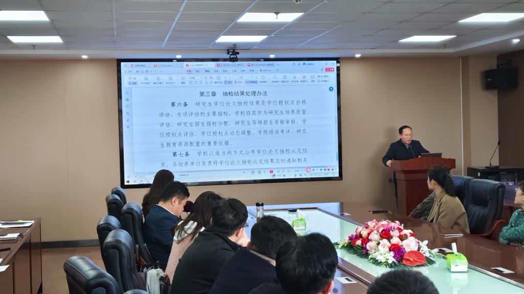 会上,熊猛副院长详细解读了我校出台的《研究生学位论文抽检管理办法》,重点分析了抽检范围、“存在问题论文”的处理措施等。他强调论文抽检不仅是检验学生成果,更是检验导师的指导成效。导师需在选题、研究方法、学术规范等环节全程把关,尤其要防范文献引用不规范、数据造假等隐性问题。