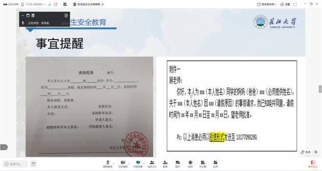 会议中还就假期请销假事宜进行了明确提醒,展示了请销假单的规范填写要求以及家长知情同意的短信发送流程,确保学生假期去向明确、管理规范。