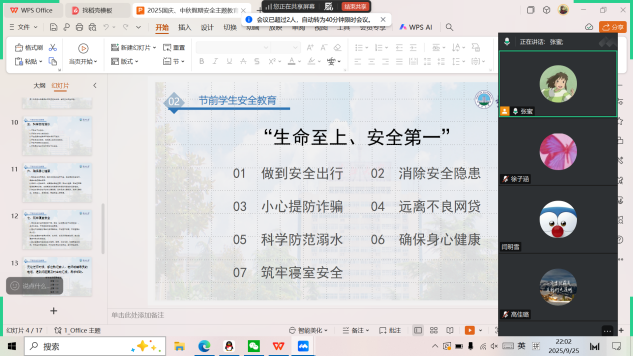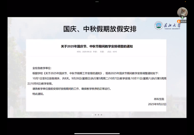 会议伊始,会议负责人通过线上屏幕共享,向同学们详细解读了《关于2025年国庆节、中秋节期间教学安排调整的通知》,明确10月1日至8日放假调休,共8天,同时提醒大家注意9月28日(星期日)和10月11日(星期六)的教学安排调整,确保假期前后教学秩序正常衔接。