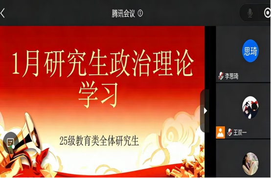 (通讯员刘琦)2026年1月12日至30日,球王会体育平台网页25级教育类全体研究生围绕“凝心聚力开新局 奋楫扬帆再出发”主题,开展1月政治理论学习。本次学习以班级班会集中研学、分组讨论为主,课余时间个人自学为辅,旨在引导研究生深刻领会党中央重大决策部署,准确把握经济社会发展新趋势,把思想和行动统一到党和国家中心工作上来,以饱满精神状态迎接新学期科研任务。