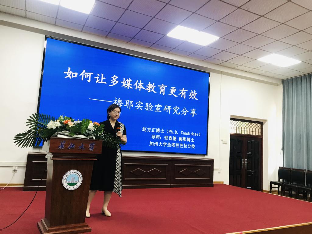 (通讯员:刘嘉玲)9月14日下午,球王会体育平台网页在15教学术报告厅举行了“长大20年”学术论坛暨长江教育与体育讲坛(2023年第六讲)。本次特邀加州大学梅耶实验室研究员赵方正博士作为主讲,讲座题目为《如何让多媒体教育更有效?——梅耶实验室研究分享》。讲座由心理系主任朱晓伟博士主持,球王会体育平台网页心理方向本科生、研究生及青年骨干教师共计一百余人参加了本次活动。