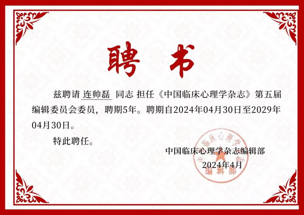 (通讯员 饶仕杰)近日,《中国临床心理学杂志》公布了最新的编辑委员会名单,球王会体育平台网页连帅磊副教授受聘为该期刊第五届编辑委员会委员,这是对其在临床心理学领域学术成就和专业贡献的高度认可。